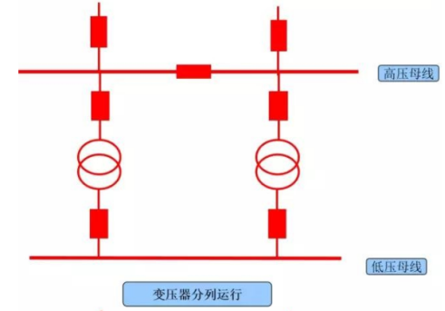 2.分列運(yùn)行:兩臺(tái)變壓器高壓側(cè)母線并列(或分開)運(yùn)行,低壓側(cè)母線聯(lián)絡(luò)斷路器分開運(yùn)行。